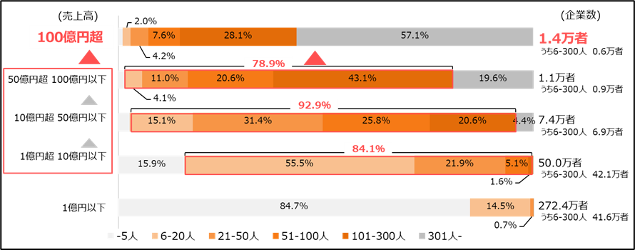 この政策の方向性を受け、2023年2月15日より「中小企業の成長経営の実現に向けた研究会」が実施されており、2023年6月22日に中間報告書(※2)が、2024年6月28日に第2次中間報告書が公表されている(※3)。これらの中間報告書では、中小企業政策の新たな方向性として、中小企業の「100億企業」への成長を目指すことが打ち出された。図表1に示す日本の中小企業の売上高規模に占める従業員数規模の分布をみると、売上高1~100億円の企業は、中小企業規模の従業者数6~300人である企業と概ねボリュームゾーンが一致しており、中小企業が100億企業へと成長していくことは、従業員数300名を超える中堅企業クラスへのステップアップを表す。