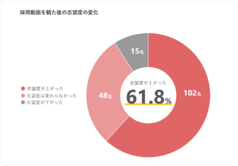 企業の採用動画を「観た」と回答した165名に、採用動画を見て印象や志望度に変化があったかを聞いたところ、「志望度が上がった」と回答した人は102名であった。「志望度が下がった」と回答した人は15名にとどまっており、採用動画を見ることによってマイナスイメージにつながることは少なそうである。