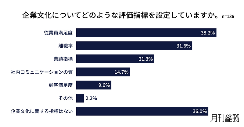 企業文化に関する評価指標について尋ねたところ、「従業員満足度」が38.2%で最多、「離職率」31.6%、「業績指標」21.3%が続いた。「指標はない」とする回答も36.0%あり、評価軸の不在が課題であることも明らかになった(n=136)。