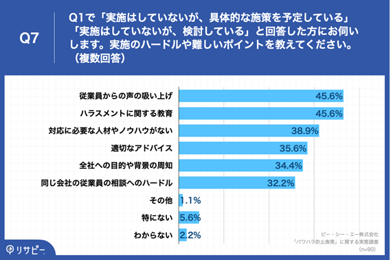 Q1で「実施はしていないが、具体的な施策を予定している」「実施はしていないが、検討している」と回答した方に、「Q7.実施のハードルや難しいポイントを教えてください。(複数回答)」(n=90)と質問したところ、「従業員からの声の吸い上げ」が45.6%、「ハラスメントに関する教育」が45.6%、「対応に必要な人材やノウハウがない」が38.9%という回答となった。