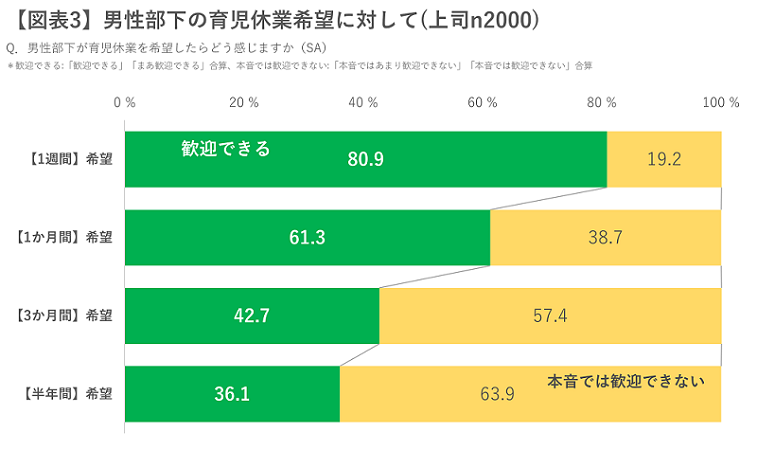 男性部下の育児休業を「歓迎できるかどうか」を、「男性部下の育休取得希望期間」ごとに聞いた。「歓迎できる」とした人は、「1週間」では80.9%だが、長期間になるほどスコアが下がり、「3カ月間」以降では「本音では歓迎できない」が過半数となった。