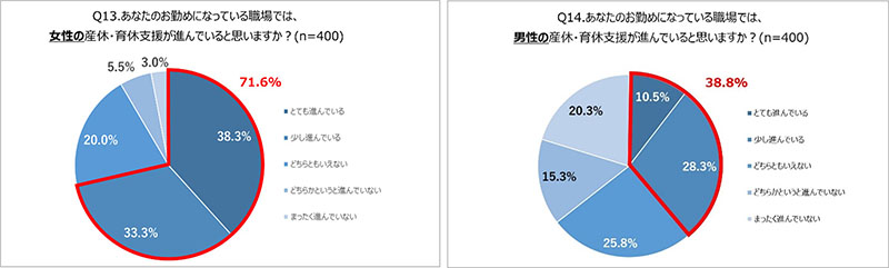 昨今、男女ともに育休推進企業も増えているなかで、女性の育休支援が進んでいると回答したのは71.6%と高い結果が出た。その一方で、男性の育休支援が進んでいると感じる人はわずか38.8%と大幅に下回る結果となった。